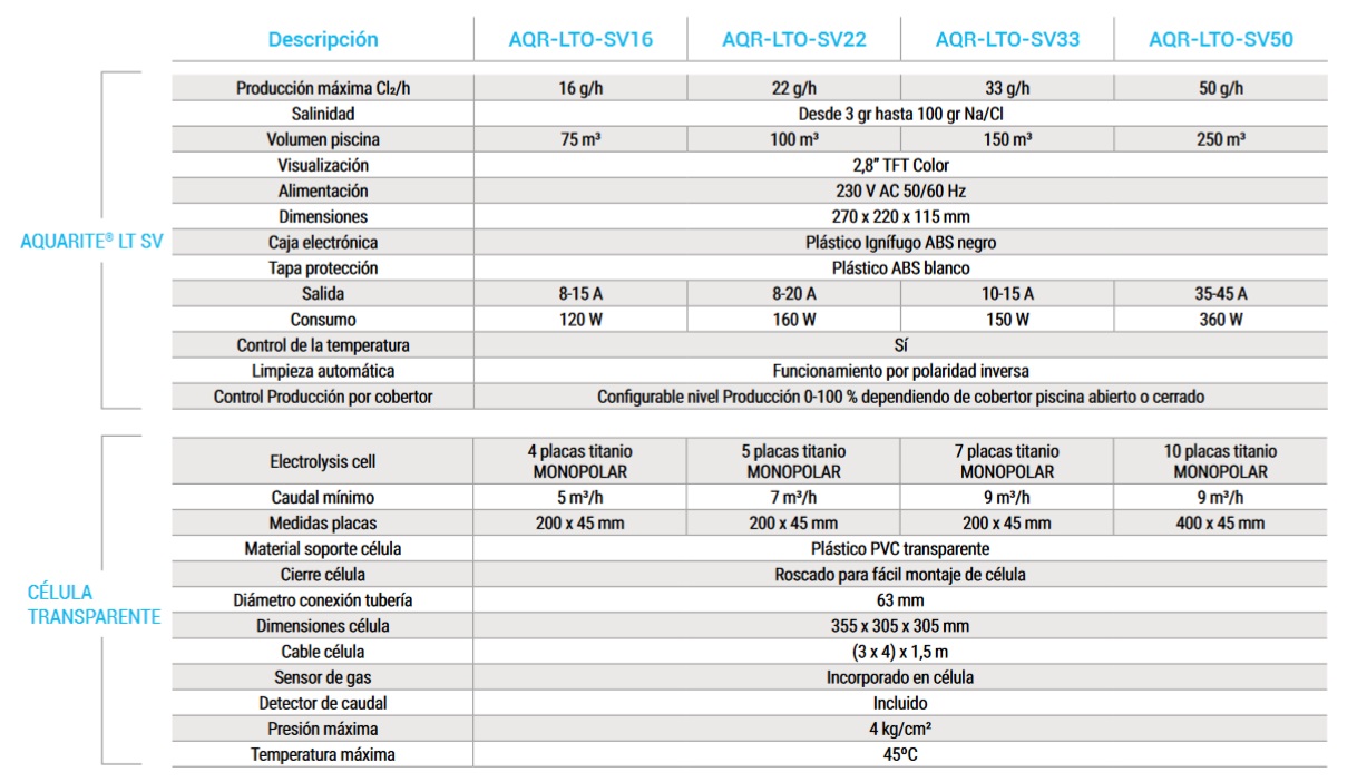 | Modelo Clorador Salino | Clorador salino AquaRite LT SV – 16 gramos, Clorador salino AquaRite LT SV – 22 gramos, Clorador salino AquaRite LT SV – 33 gramos, Clorador salino AquaRite LT SV – 50 gramos |