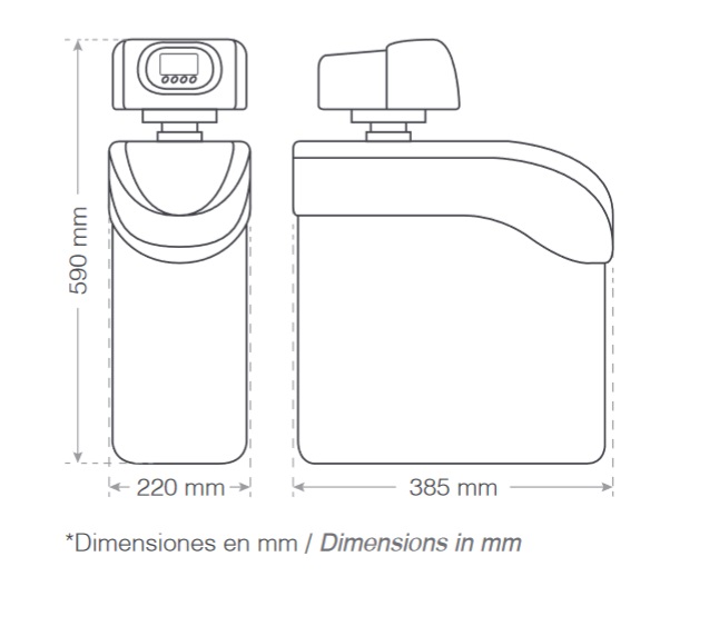Descalcificador Minisoft de 7 litros de resina ideal para hogares con poco consumo de agua. Diseño ultracompacto de reducidas dimensiones recomendado para espacios de alturas muy limitadas.