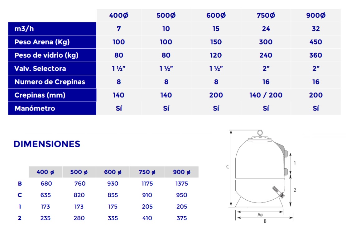 | Diámetro Filtro | Filtro Beige QP 400ø, Filtro Beige QP 500ø, Filtro Beige QP 600ø, Filtro Beige QP 750ø, Filtro Beige QP 900ø |