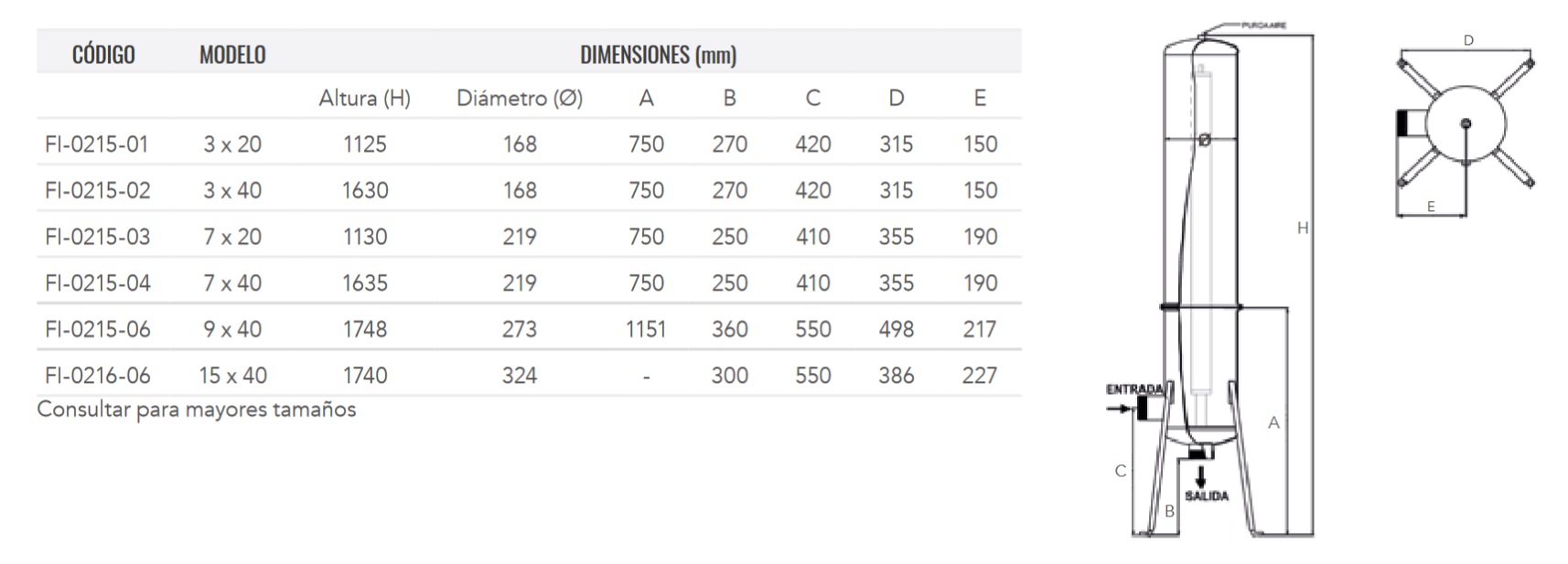 - FI-0215-04 | Modelo 7 x 40 | Conexión 2 1/2″ | Caudal 30 m³ | 7 cartuchos 40″.