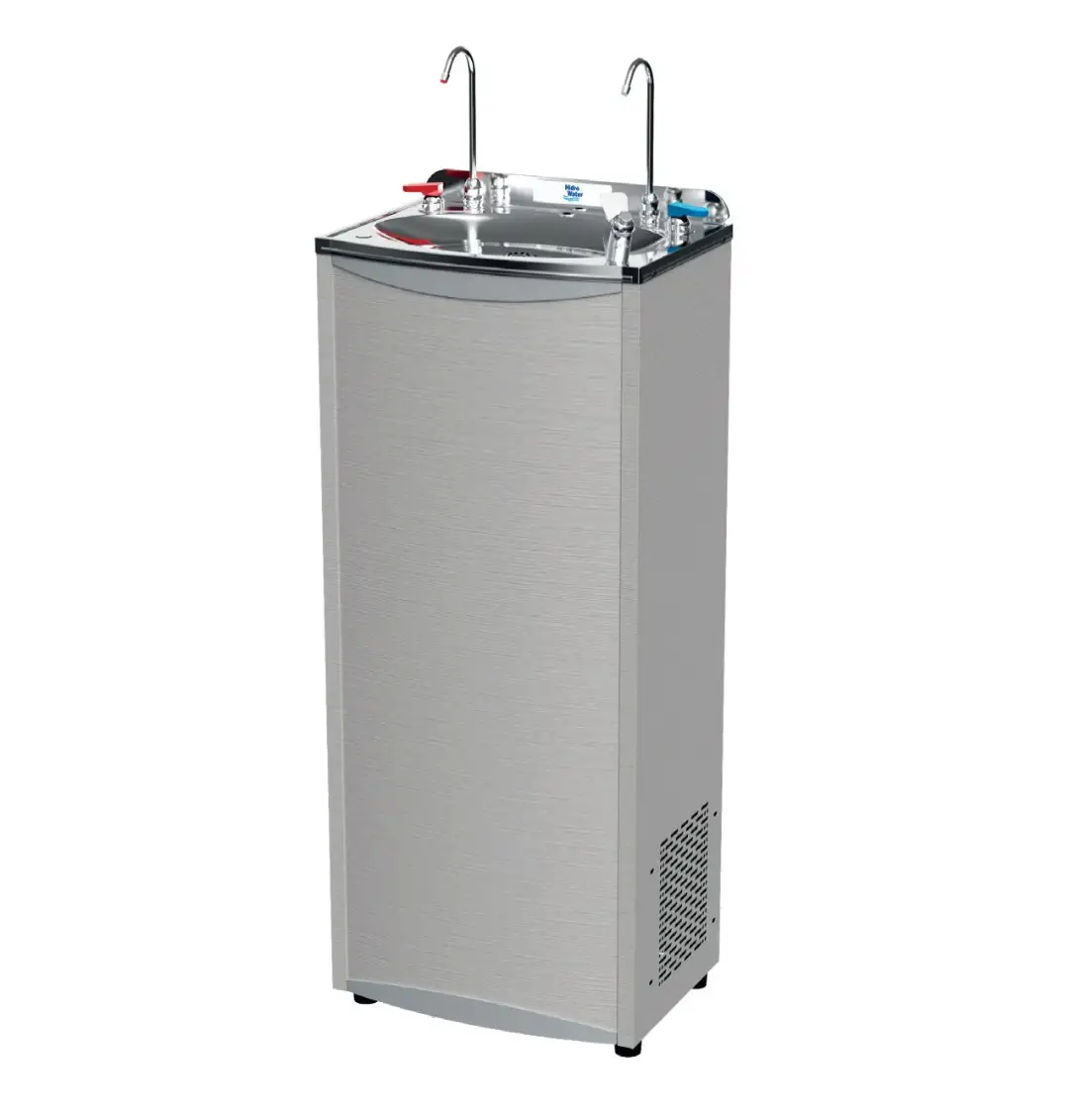 Fuente refrigeradora Modelo Inox con suministro de agua fría y caliente que incorpora equipo de tratamiento de agua mediante ósmosis inversa con bomba. Fabricada en acero inoxidable, ofrece gran resistencia a la corrosión, robustez y durabilidad.
