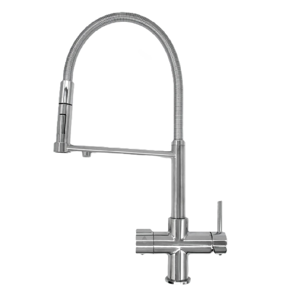 Grifo ósmosis 3 vías, modelo Durban, fabricado en acero inoxidable y acabado mate. Caño extraible y flexible. Ofrece agua de ósmosis y agua de la red fría y caliente. Diseño moderno y versátil para todo tipo de cocinas, perfecto para simplificar la salida de agua tratada y de la red.
