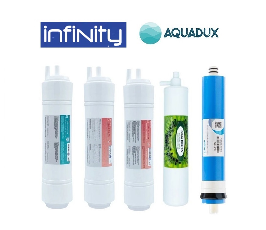 Kit de filtros y membrana para la ósmosis compacta Infinity CS de Ionfilter. Diseñados con conexión espiga a 3/8″, los filtros son una alternativa compatible con modelos de ósmosis de marcas como GreenFilter o Ionfilter.