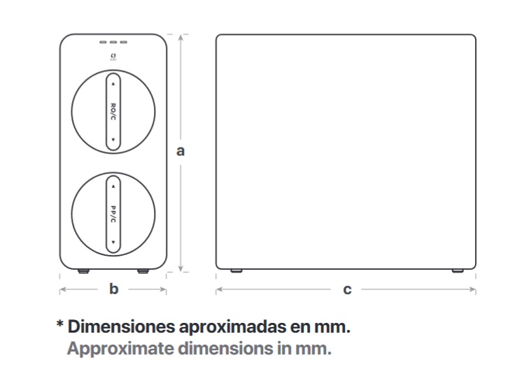 - Dimensiones del sistema: a. 334 mm alto | b. 150 mm ancho | c. 436 mm profundo