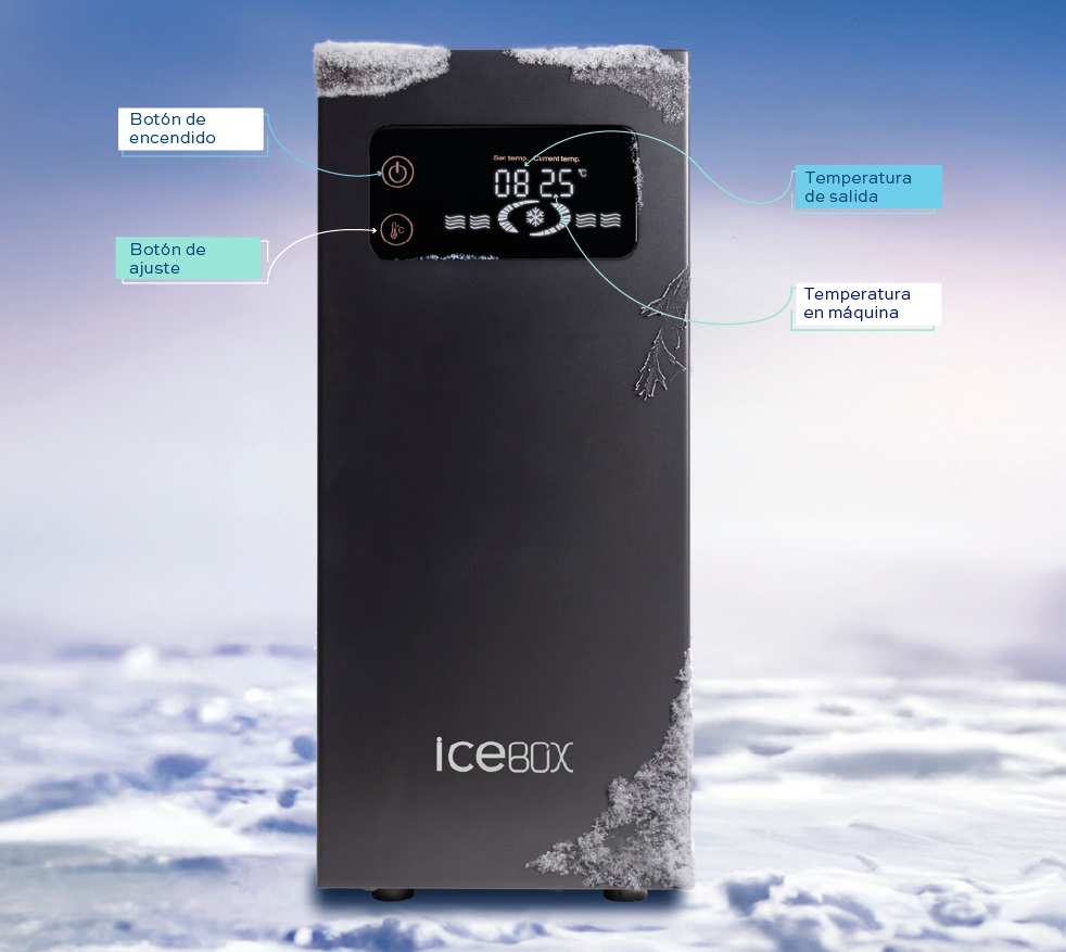 Refrigerador de agua Icebox para la producción de hasta 5 litros/hora de agua fría de ósmosis para el consumo inmediato. Temperatura ajustable de 4º a 15º y pantalla digital con indicadores.