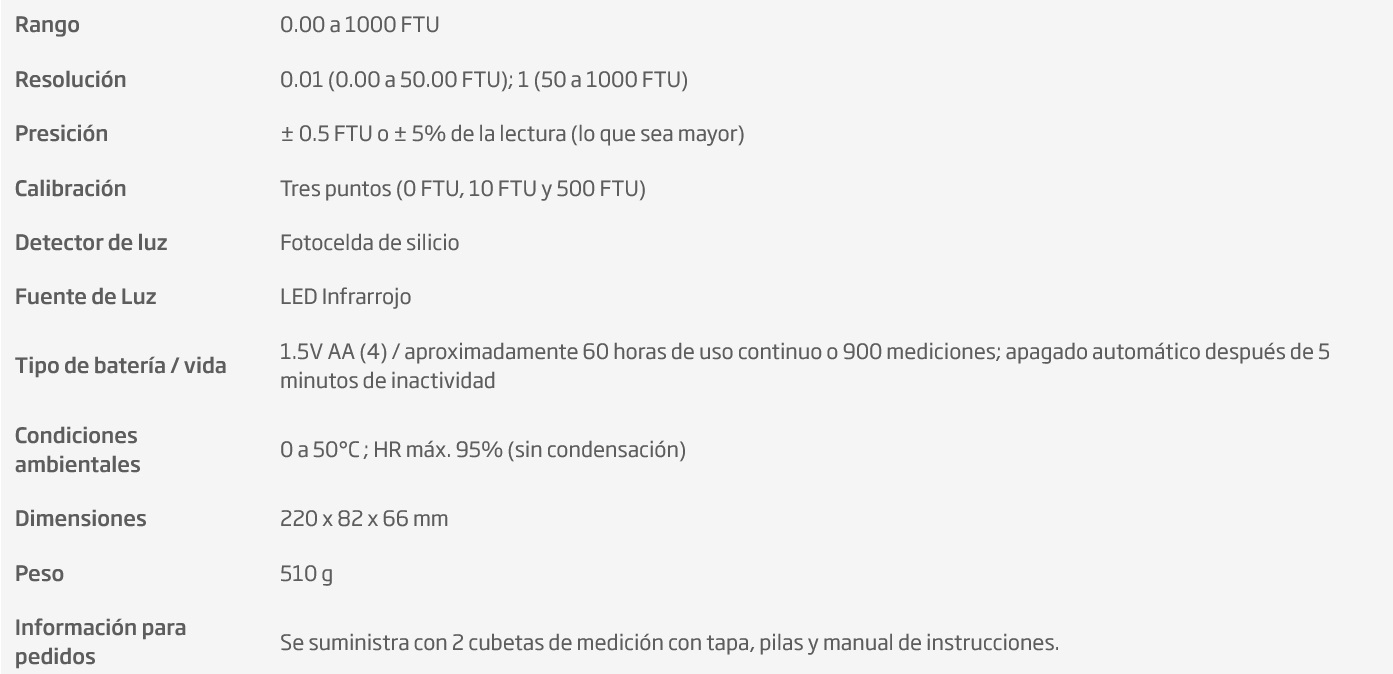 - Diseño de haz simple: Mide turbidez en un rango de 0.00 a 1000 FTU con detección de luz dispersa a 90°.