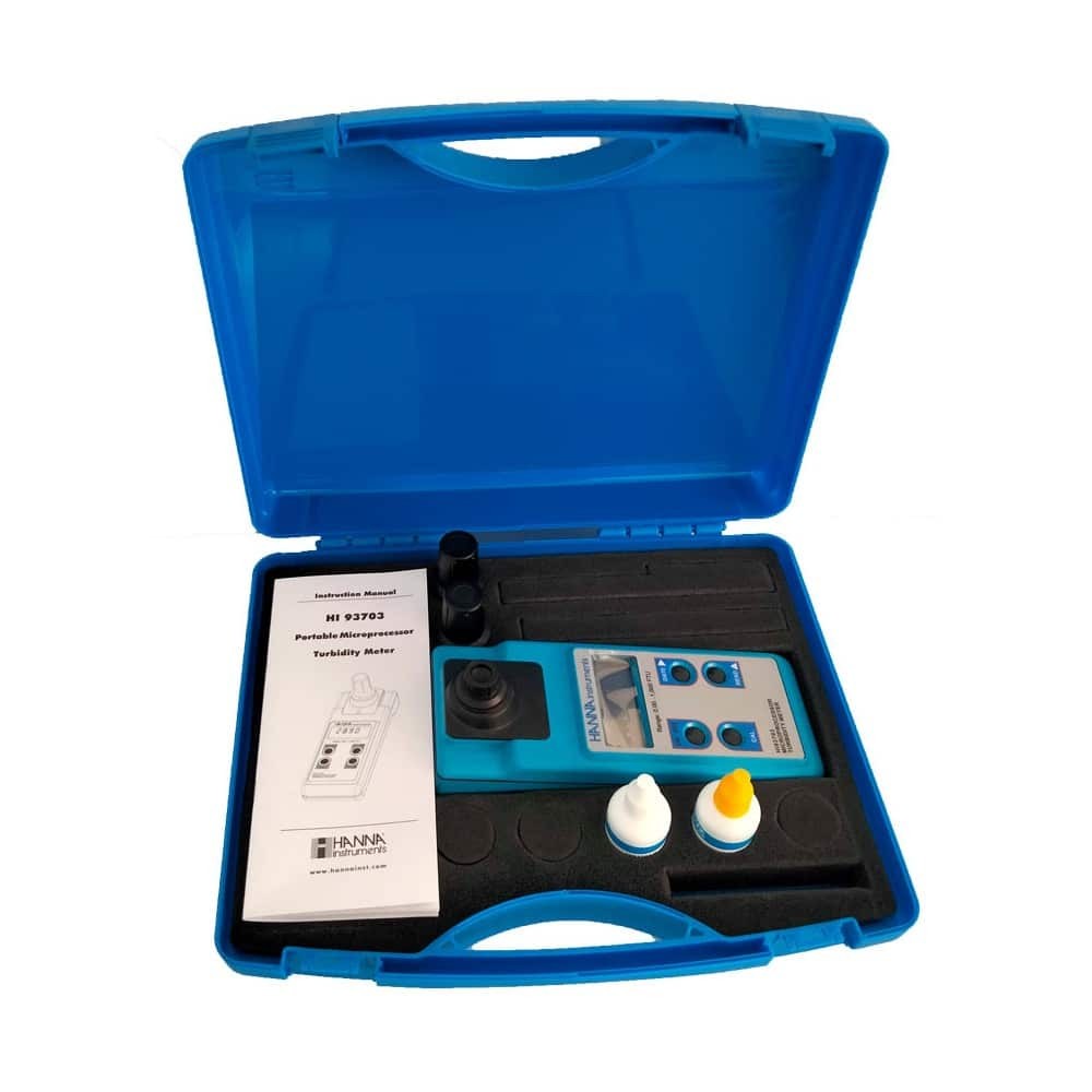 - Turbidimetro HI93703 con 2 cubetas de medición, pilas y manual de instrucciones.